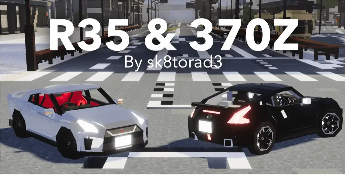 Nissan R35 GTR + 370Z Car Addon Pack - Simple Car Series drops two legends into Minecraft Bedrock/MCPE: a brutal, fast R35 GTR and a nimble 370Z with some Nismo-style color variants, both built for smooth driving, racing, and city roleplay.