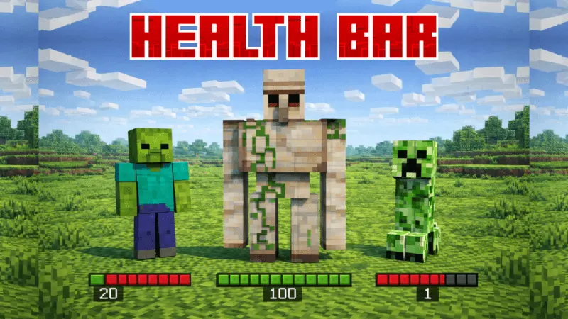 Health Bar (API) Mod adds a color-based health bar system to Minecraft Bedrock/MCPE so you can read enemy health at a glance without numbers, using simple colors from red (near death) up to blue (very healthy).