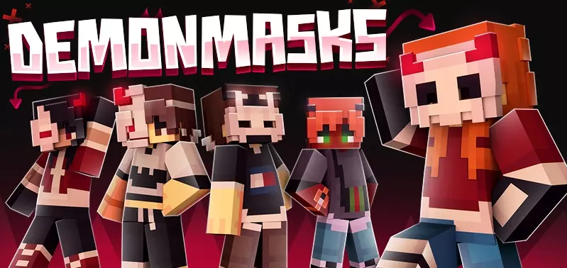 Demon Masks Skin Pack adds 7 demon-themed skins to Minecraft Bedrock, featuring creepy masks and glowing horn designs that are perfect for PvP, horror maps, and dark roleplay worlds.