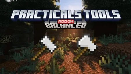 Practicals Tools Balanced adds time-saving utility tools to Minecraft Bedrock/MCPE, including 3×3 mining hammers you activate by sneaking and a Great Axe that drops whole trees in one go, built to cut grind without letting you accidentally wreck your builds.