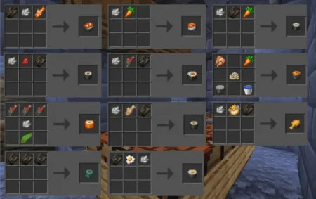 SushiCraft [Food Expansion] Mod keeps the pantry honest: every recipe pulls from things you already gather in Minecraft—fish off the dock, kelp from the shallows, village crops, basic staples. The payoff is choice. Some plates chew fast when a skeleton won’t give you breathing room, others carry saturation long enough to cross a desert or chew through an ore vein without babysitting the hunger bar. Nothing is over-tuned; it’s balanced variety that respects progression with Achievements On and zero commands.