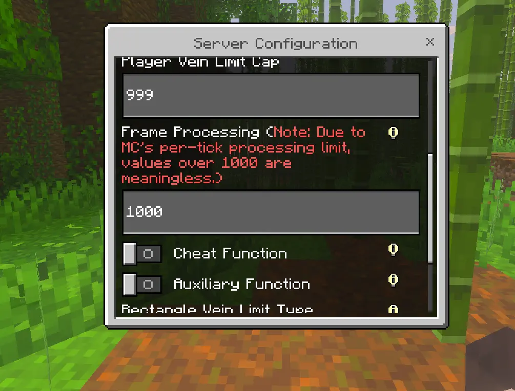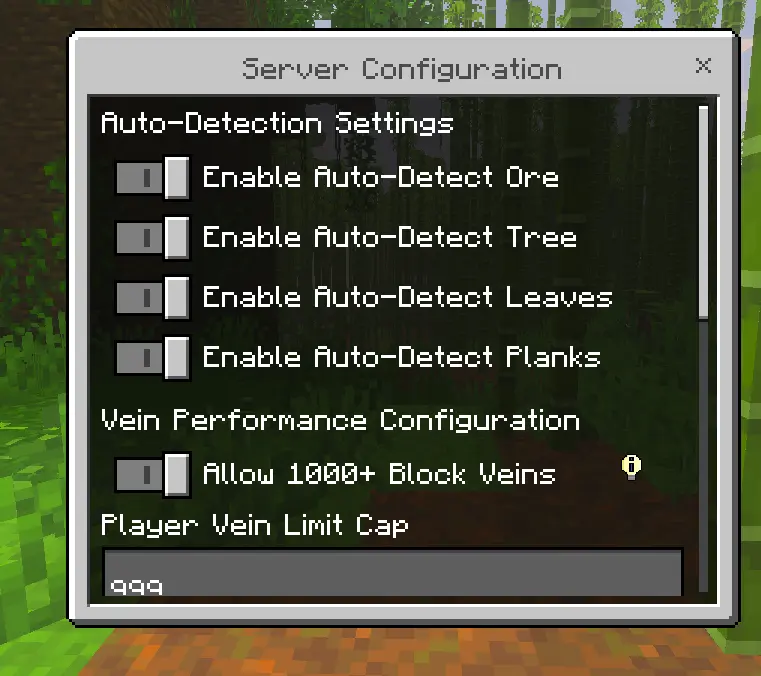 Naitang’s Vein Miner Mod keeps the grind honest but fast. Flip vein mining on for yourself only, choose whether it triggers while crouching or all the time, and the next swing clears a full vein or drops an entire tree. Because the settings are personal, your choices don’t mess with anyone else on the server. Set a durability threshold so the effect won’t fire when your axe or pick is about to crack, and use a sensible block cap so you don’t nuke half a hillside by accident. For pickups, pick your style: magnet-pull to hoover the drops, command-give if you want them delivered cleanly, or the “matter mass” option if you prefer a single stack to sort later.