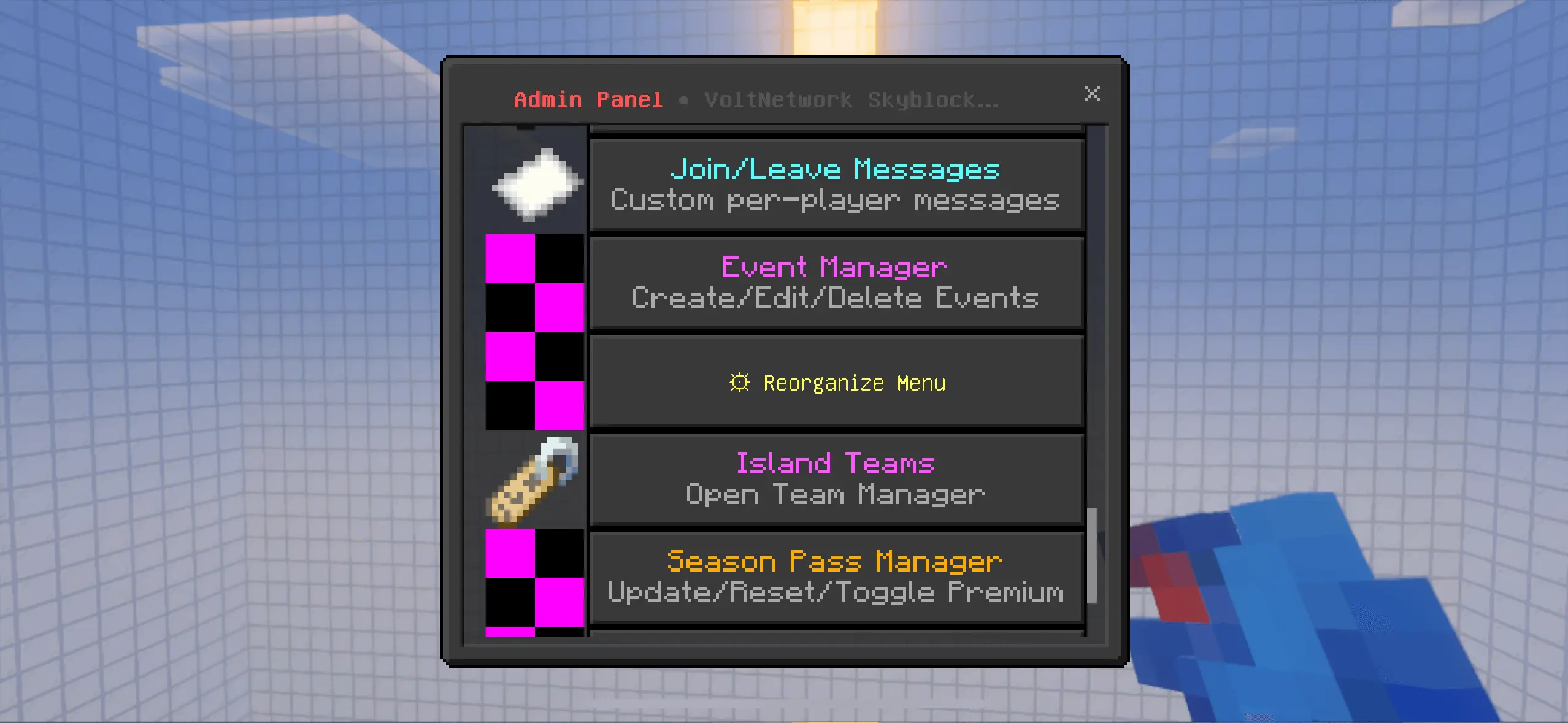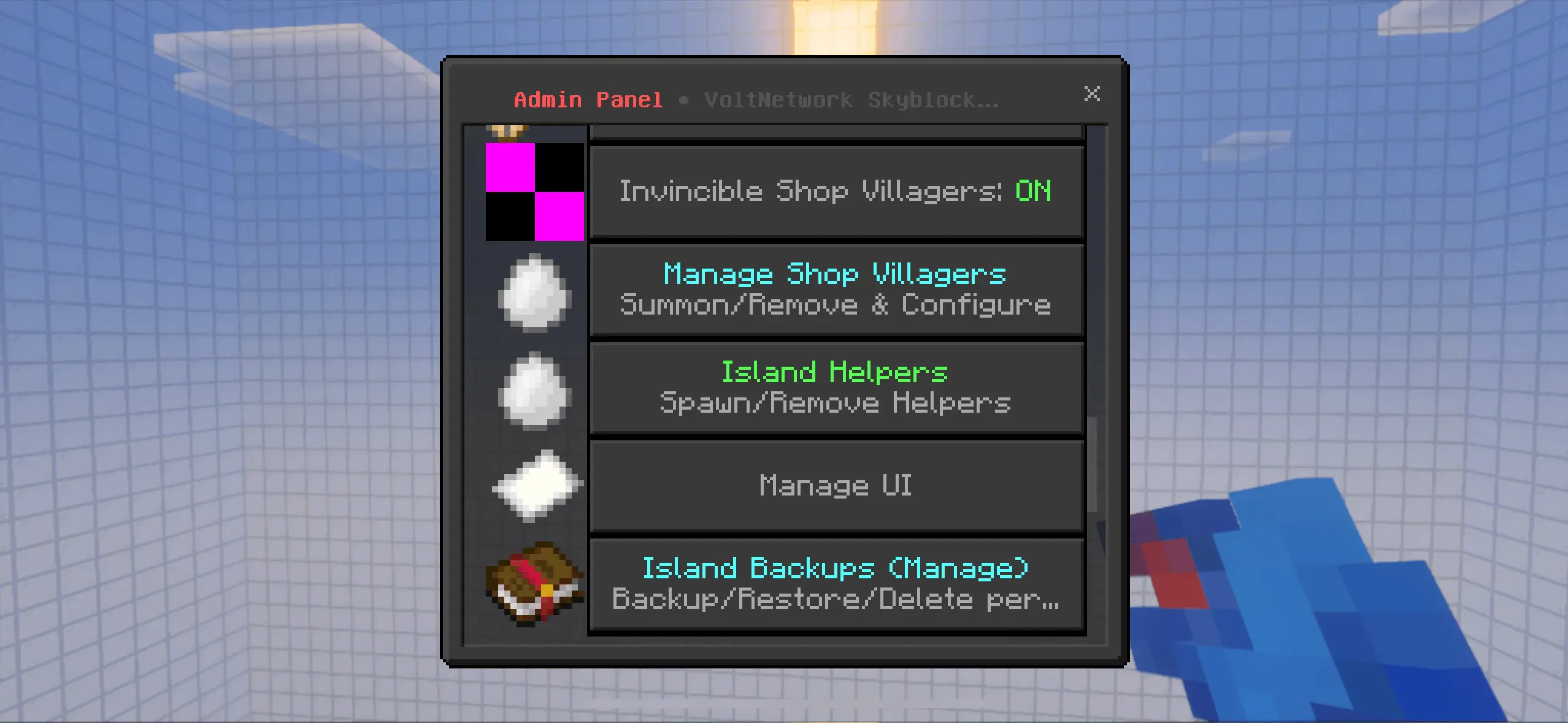 VoltNetworks Skyblock gui Mod starts you fast and keeps you moving. Spin up a fresh island through the built-in UI, get placed safely in the void, and use the same menus to manage warps, upgrades, and your balance. The loop is pure Skyblock but way less fiddly: expand, sell, reinvest, and watch your island turn from cramped starter pads into a proper multi-level base without digging through chat commands to do basic tasks. Because the economy and upgrade tracks are tied into the interface, you always know your next milestone and what it’ll cost.
