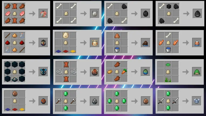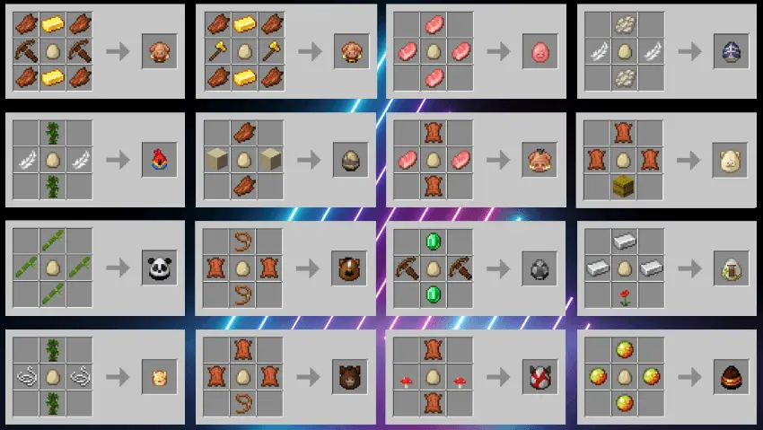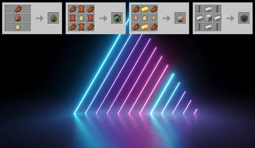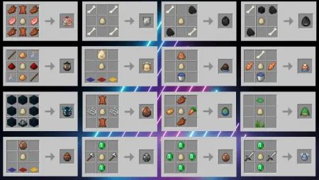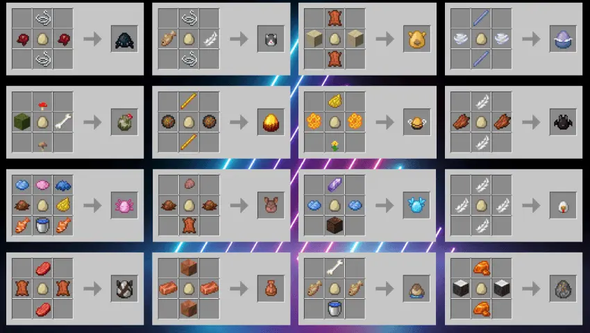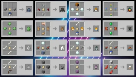 The pattern stays easy to remember: every recipe revolves around a regular chicken egg plus items that are clearly tied to that mob. You can use normal, brown, or blue eggs for any recipe, so you’re not locked into one type. Most recipes show up in the crafting book, which makes them super convenient once you unlock the pieces. The only exceptions are the Wither and Ender Dragon spawn egg recipes—you still can craft them, but you need to place those patterns manually in the grid.