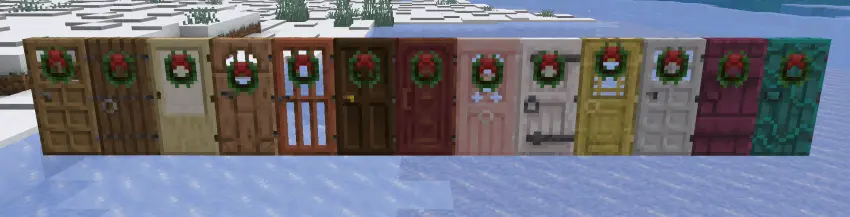 Winter Additions (Christmas Additions) Mod wraps your world in permanent winter so it feels like December every in-game day. Snow is always falling in the overworld, with extra snow and ice scattered around to sell the cold weather vibe, and you can toggle that effect off with subpacks if you just want the holiday decorations. Some core vanilla textures get a seasonal makeover too: chests switch to their classic console/Java holiday look, and wooden doors show wreaths so houses, shops, and spawn hubs look instantly decorated.