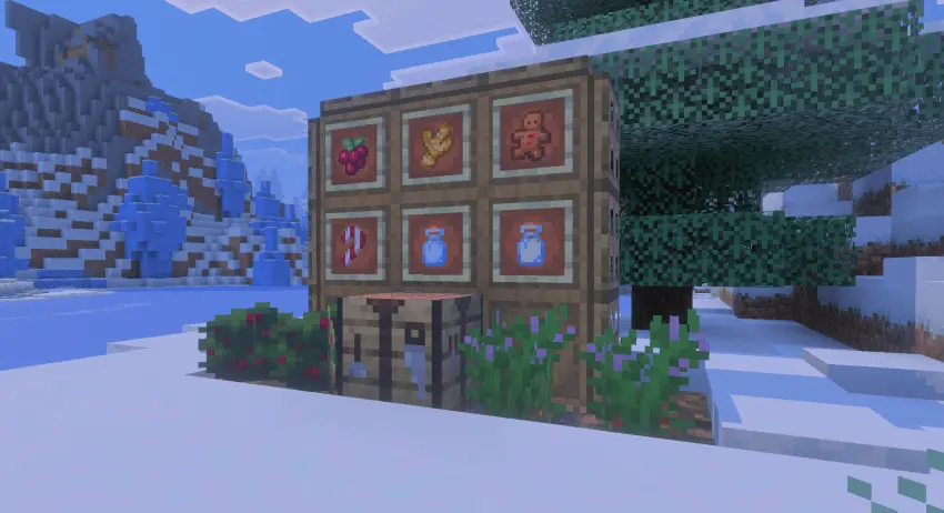 For ingredients, you can dig up Ginger occasionally from dirt (with better odds in rooted dirt), then plant it to grow more. Cinnamon comes from jungle logs, and Cranberries naturally show up in Snowy Taigas and Mangrove Swamps. You also get Candy Canes and Gingerbread for quick bites, and the pies are awesome because they can be placed as decorations and still eaten—Apple Pie, Pumpkin Pie, and a Spiced Pumpkin Pie that adds a holiday twist. Christmas Food Mini Pack Mod makes kitchens and dining areas finally feel worth building in Minecraft Bedrock.