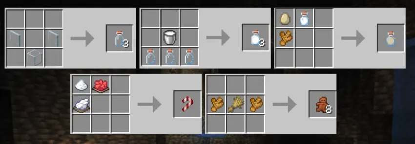 The drinks are the star here. You’ve got Milk Bottles you can craft from Empty Milk Bottles and a milk bucket, plus Chocolate Milk Bottles for a sweeter vibe. Eggnog is the festive option that clears status effects too, and it comes with a small buff that makes it feel like a real reward when you’re out in the cold and don’t want to head back home yet.