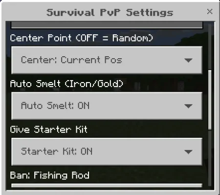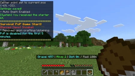 Setup is clean too. Admins get a Setup Book that opens a UI menu where you can set battlefield radius, adjust timers for grace and overall game length, and choose whether the center is your current location or random. If you want extra spice, there are optional “pro rules” like auto smelt for iron and gold (with a pickaxe), a starter kit for everyone, and banned-item toggles to remove stuff like fishing rods, lava buckets, or snowballs. During the match, a real-time HUD shows phase, time left, alive count, and border distance so players always know what’s happening.