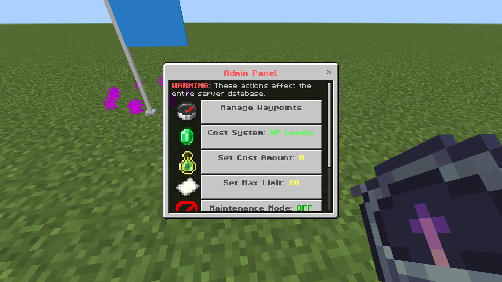 Teleporting is handled through a clean menu that can jump to private points, public warps, your home slot, or even saved death locations so you can get back to your stuff. For survival balance, admins can set teleport costs using XP or a scoreboard objective like “money” or “coins,” and the mod also supports invites, team/public sharing, and an operator panel to review, delete, limit, wipe data, or toggle maintenance mode.