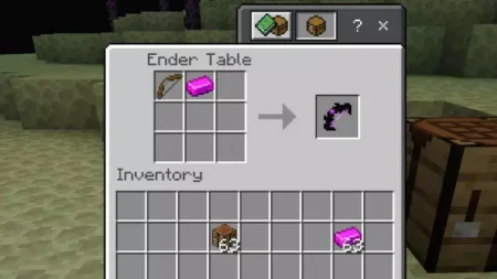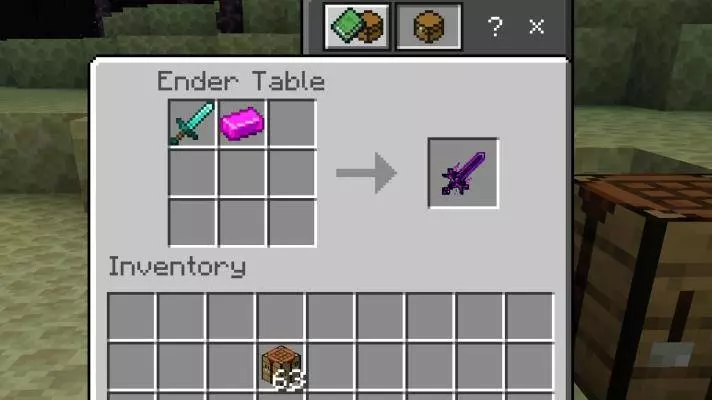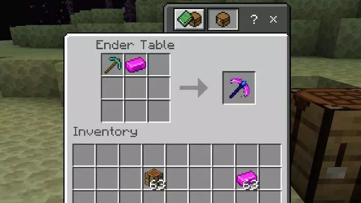 You can’t craft the tools in a normal table. You build an Ender Table (an enchanted-style crafting table) and use it to make the Ender Sword, Pickaxe, Axe, Hoe, Shovel, and Bow & Arrow. The Ender Sword throws off rainbow-magenta particles and hits for crazy damage (it says 100), although big bosses like the Wither, Warden, and Ender Dragon can still take more than one hit.