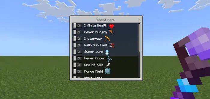 Most of the cheats are straight-up power toggles. You can give yourself effects like instant_health for Infinite Health, saturation for Never Hungry, haste for Instabreak, speed for faster movement, jump_boost for Super Jump, water_breathing so you never drown, night_vision for dark caves, and fire_resistance so you never burn. It also includes more “rule-breaking” options like One Hit Kills (it applies 1000 damage when you attack), a Force Field that repels entities before they reach you, and an Item Magnet that pulls drops toward you. There’s even Infinite Durability so tools don’t break, which is perfect for long build sessions.