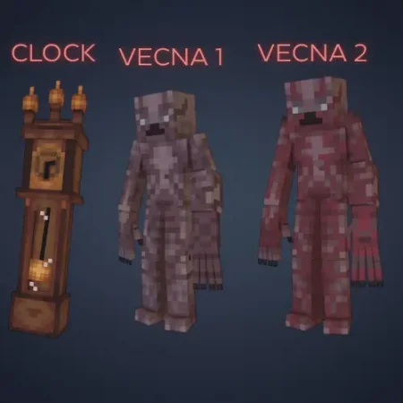 Vecna is the “boss energy” part. Vecna 1 has 500 health and a brutal mechanic where it lifts you up and can instantly kill you if you can’t overpower it fast enough, and you summon it using Vecna’s Clock (crafted with 7 wood blocks, 1 clock, and 1 netherite ingot). After you beat phase one, Vecna 2 spawns with 800 health and can pull nearby mobs toward itself, turning the fight into a messy crowd-control problem. There’s also a massive Mind Flayer with 10,000 health that’s basically meant to be untouchable, pushing you away with a huge interaction radius even though it doesn’t hit that hard. On the “gross monster” side, rats can trigger a meat monster (50 health) after you kill them, two small meat monsters can merge into a hospital monster (150 health), and the Meat Mind Flayer adds another dangerous evolution with 300 health and high-quality animations.