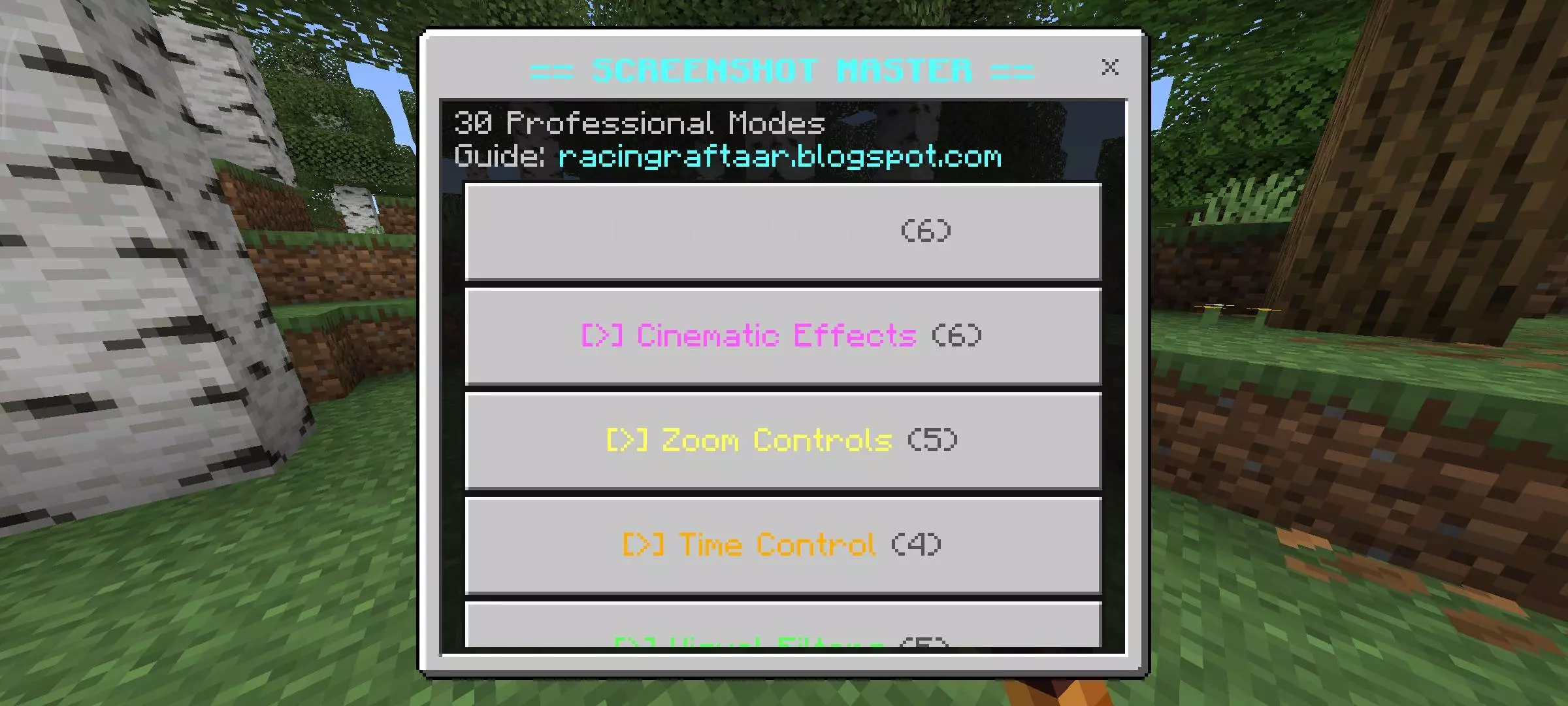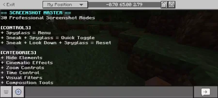 Screenshot Master - Cinematic Capture Mod mine Today, 15:39 16 Addons 26 / Addons 1.21 Screenshot Master - Cinematic Capture Addon will help you take screenshots.Installation guile:- Download file Addon;- Use minecraft- Open the downloaded file to install;- Activate the settings;- Play with the new mod!screenshot-master.mcpack [20.94 Kb] (downloads: 0)