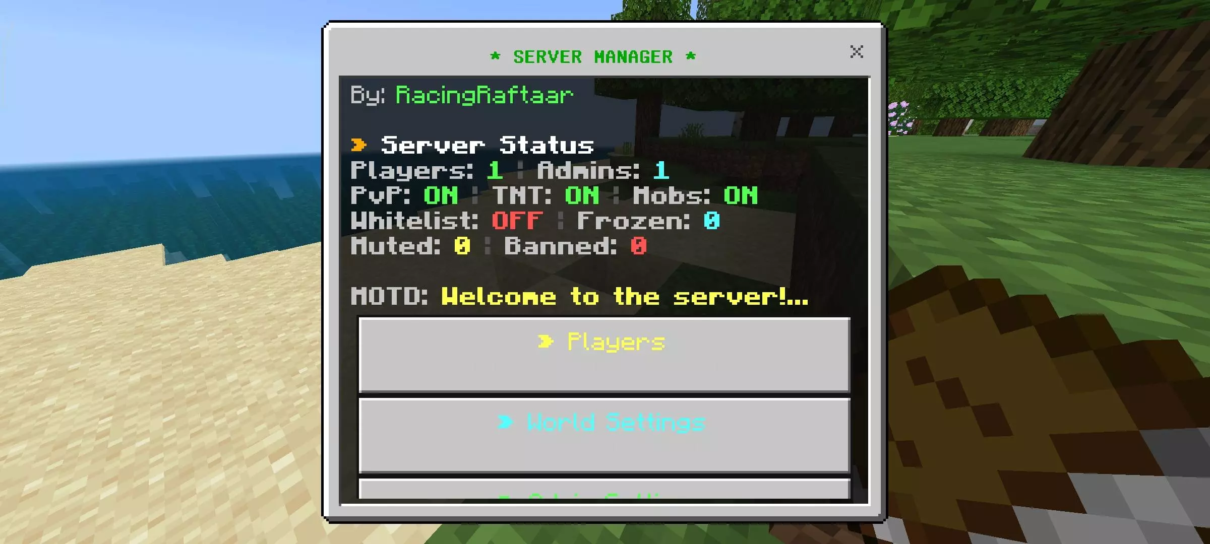 Server Manager Mod mine Today, 10:53 16 Addons 26 / Addons 1.21 Server Manager Addon will help you manage your server better.Installation guile:- Download file Addon;- Use minecraft- Open the downloaded file to install;- Activate the settings;- Play with the new mod!servermanager.mcpack [19.82 Kb] (downloads: 0)