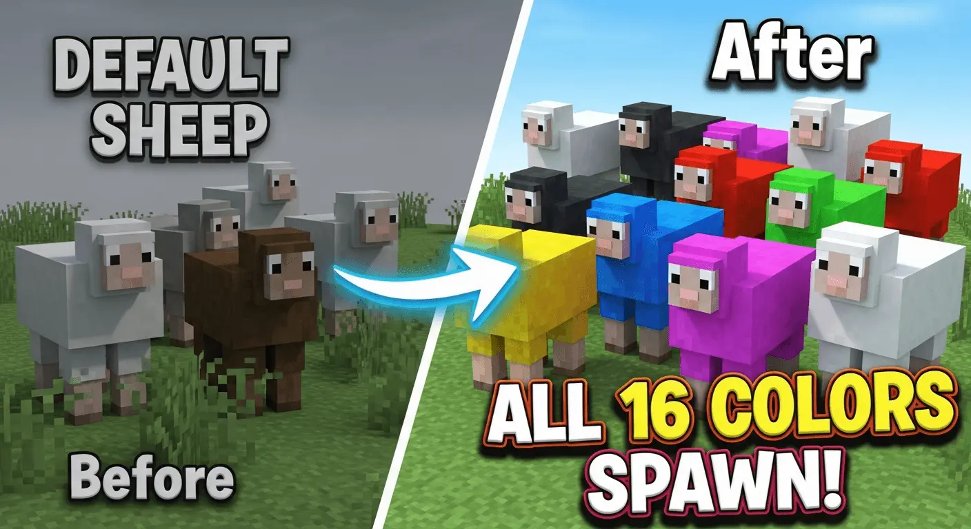 All colour Sheep Mod turns the overworld into a full wool rainbow, letting all 16 sheep colours spawn naturally, plus rare Rainbow Sheep, so your farms, banners, and builds never feel stuck with boring white flocks again.