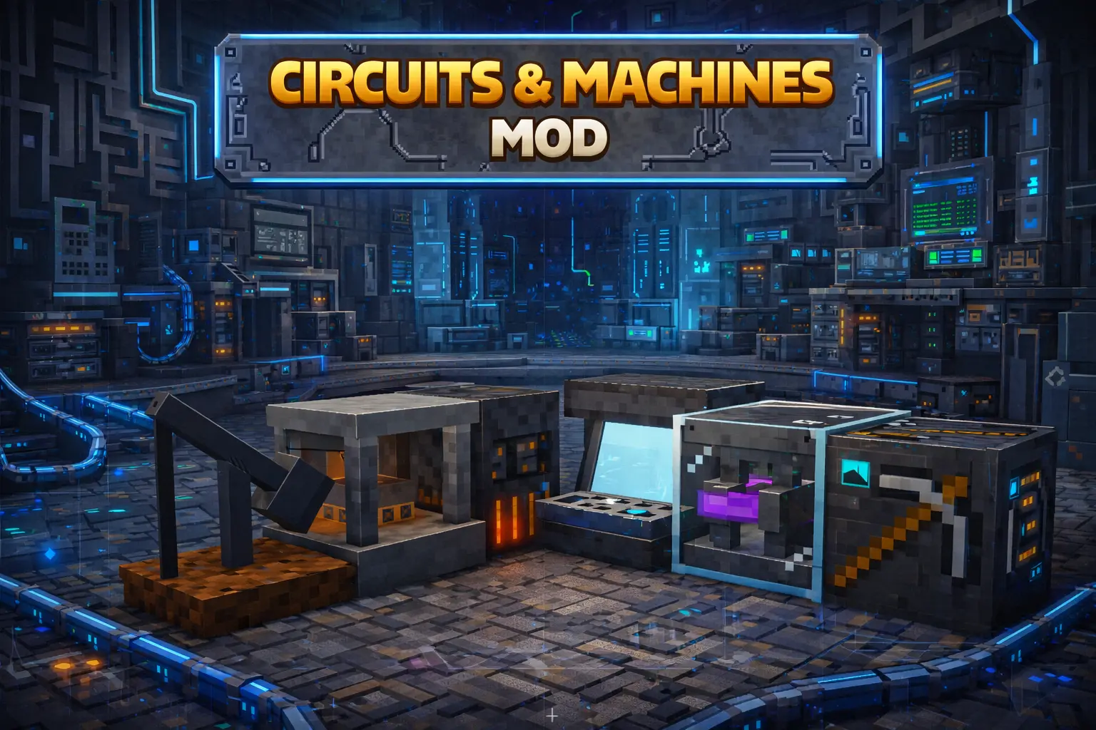 Circuits & Machines Mod is a Minecraft Bedrock/MCPE tech-style addon packed with roads, machines, ores, fuel systems, bitcoin trading/mining, high-tier crafting components, and late-game armor/weapons—plus a drivable car and a tameable Robot Wolf for survival power runs.