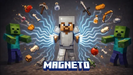 MAGNETO Mod (no player.json) adds a Magneto-style power to Minecraft Bedrock/MCPE that lets you forcibly control the bodies of entities, activated by sneaking to trigger the Magneto skill.