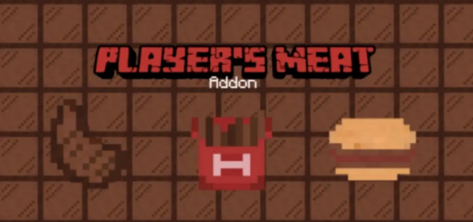 Player's Meat Mod turns PvP into something way darker by making players drop Raw Flesh on death, which you can cook, craft into blocks, or turn into Flesh Burgers and Flesh Fries in your Minecraft Bedrock world.