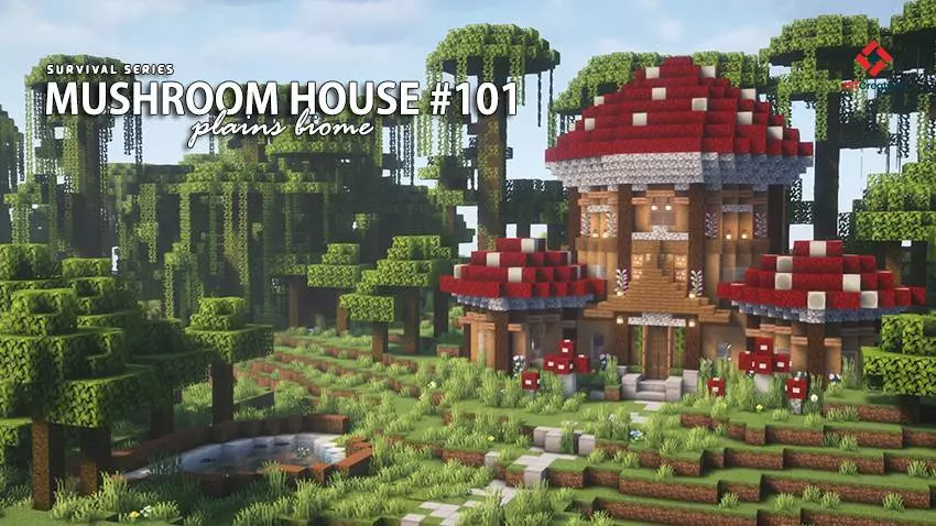 Survival Mushroom House Mod is a Minecraft Bedrock/MCPE survival house build set in an Island Survival biome, featuring a cozy Mushroom House with a fully built interior and exterior, useful starter items, and a spawn point already set inside.
