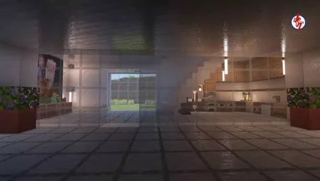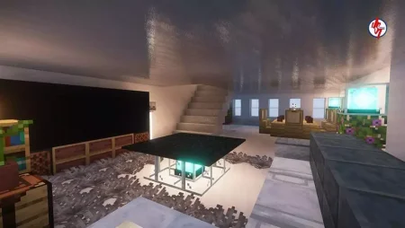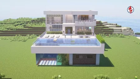 Because Achievements are on, every improvement feels earned. Use the river as your highway—drop a simple dock, stage boats, and scout bends for clay, coal pockets, and early caves. The modern footprint makes routines quick: smelt, craft, stash, then head back out before the sun shifts. Big windows let you read mob spawns from indoors, so you time exits instead of guessing. When you’re ready to scale, extend the roofline, push a glass corridor toward the water, and carve a garden terrace into the bank.