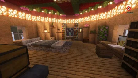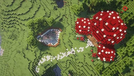 A nice extra detail is placement near an existing village, which adds that “world feels alive” atmosphere and gives you easy access to villagers for trading and background activity while you’re building up your island life. The spawn point is already set inside the house too, so if you die or reload, you’re not waking up lost on the beach. Survival Mushroom House Mod is a solid pick if you want a themed survival home that feels cozy, functional, and ready to roll.
