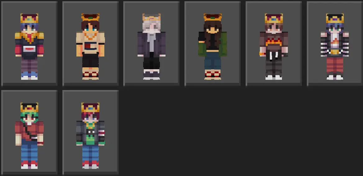 Even if you’re mostly a solo player, the pack still works for survival and creative sessions where you care about the vibe of your character in screenshots and clips. Crowned Fashion Teens Skin Pack keeps it simple: eight stylish teen skins, each with a crown, ready to drop into Minecraft Bedrock and look good anywhere you play.