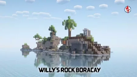 Willy's Rock Map recreates Boracay’s iconic photo spot in Minecraft Bedrock, featuring a volcanic rock outcrop that forms a tidal-island vibe with carved steps leading up to a Virgin Mary statue.